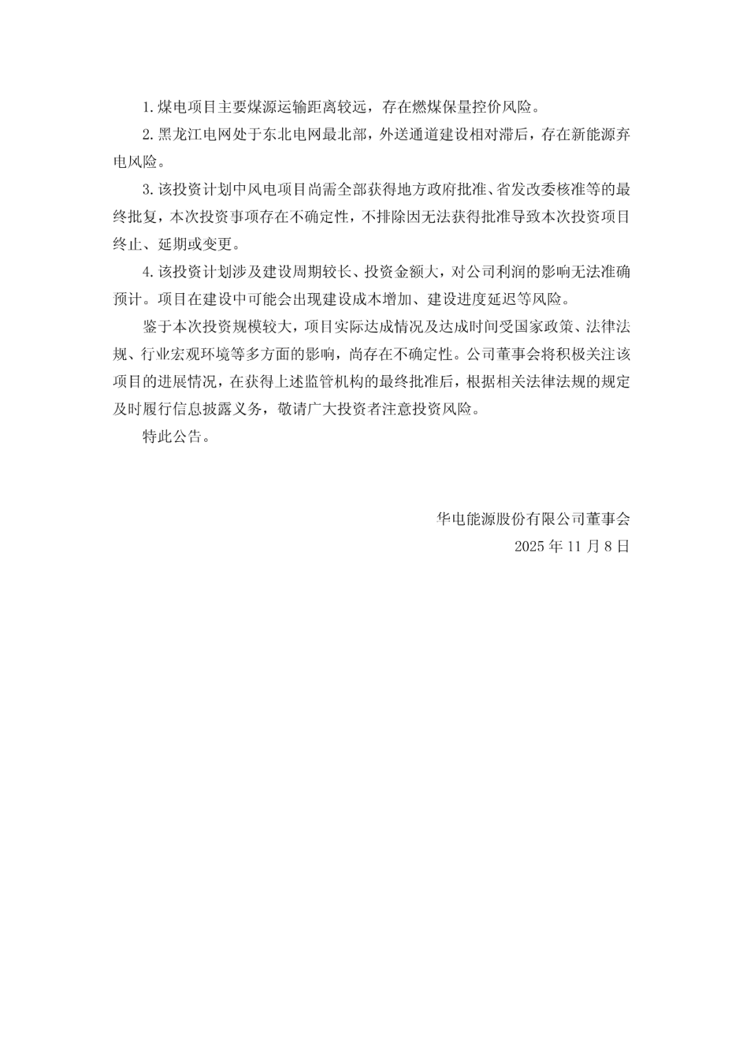 华电能源同时提示风险称,煤电项目主要煤源运输距离较远,存在燃煤保量控价风险;黑龙江电网处于东北电网最北部,外送通道建设相对滞后,存在新能源弃电风险。另外,该投资计划中风电项目尚需全部获得地方政府批准、省发改委核准等的最终批复,本次投资事项存在不确定性,不排除因无法获得批准导致本次投资项目终止、延期或变更。