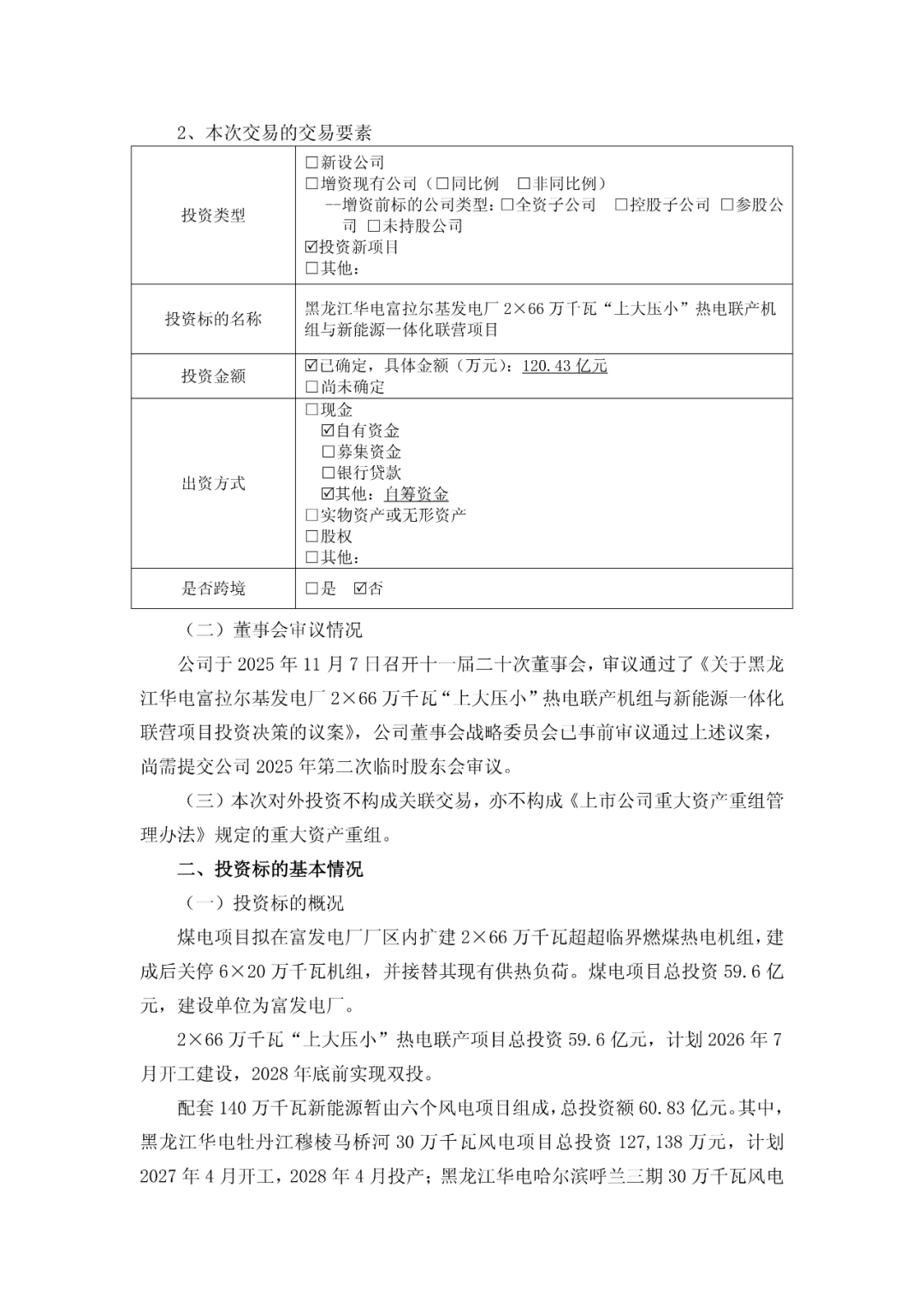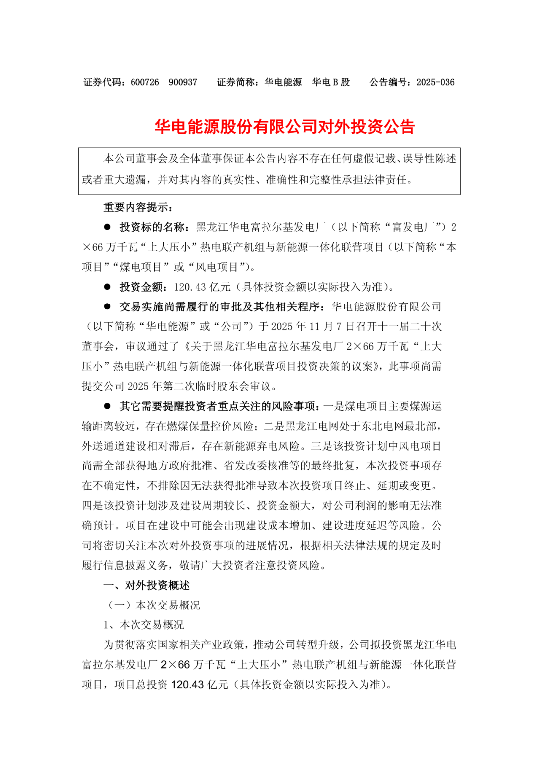风芒能源获悉,华电能源11月7日晚公告,拟投资黑龙江华电富拉尔基发电厂(下称“富发电厂”)2×66万千瓦“上大压小”热电联产机组与新能源一体化联营项目,项目总投资120.43亿元。