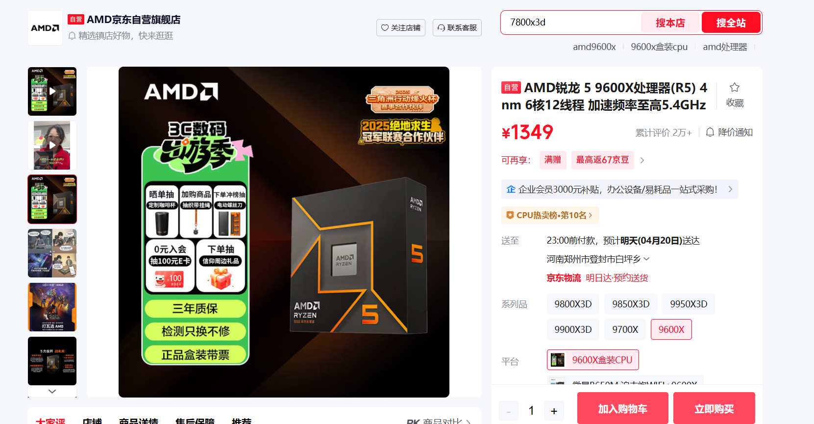 锐龙5 9600X基于台积电4nm工艺和Zen5架构,沿用经典6核12线程设计。最高睿频5.4GHz,L3缓存32MB,原生支持DDR5-5600内存,额定TDP65W,同时官方开放合规的105WTDP增强模式,切换后仍保留完整官方保修,仅需在主板BIOS内设置即可启用。采用AM5接口,兼容600/800系列主板,目前国内盒装1349元。