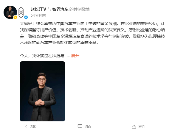 1月13日,赵长江发布与智界汽车的共创微博,官宣正式加入鸿蒙智行-智界汽车,“我将与团队一起全心打造一个真正以用户为中心的全球化标杆智能品牌,构建贯穿产品、服务与体验的独树一帜的‘AI时代用户友好体系’”。微博认证也已变更为“智界汽车执行董事及执行副总裁”。