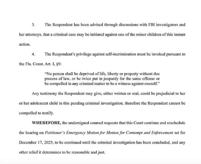 “目前,FBI正对Kepner的死亡案进行调查,而死者正是本案回应人Hudson的继女,通过与FBI调查人员及其律师的讨论,本案回应人Hudson获悉,可能将对本案中的一名未成年子女提起刑事案件调查…”