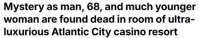 大西洋郡检察官办公室于11月26日公布,一对来自纽约市的华裔男女于本月23日被发现死于大西洋城知名的博加塔(Borgata)酒店赌场内客房。两人的死亡时间、死亡方式与彼此关系目前仍存在多重疑点,各方尚未能够确定这起案件是否为谋杀、自杀或其他复杂情形。