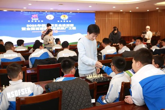 陈琪开展讲座,分享中国国际象棋发展成就;随后,两位大师与40余名学生进行车轮指示棋交流。
