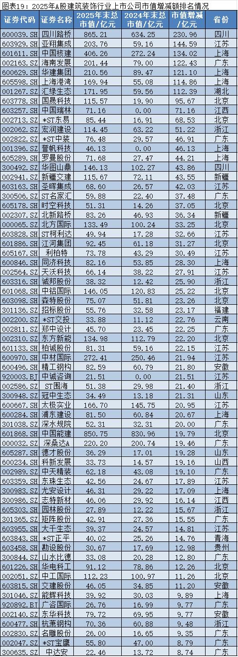 同花顺iFinD数据显示,2025年,在建筑装饰行业中,市值增加最多的是四川路桥(600039.SH),其2025年12月31日的市值约为865.21亿元,较2024年12月31日的634.25亿元增加约230.96亿元;市值减少最多的是中国建筑(601668.SH),其2025年12月31日的市值约为2119.74亿元,较2024年12月31日的2496.62亿元减少约376.88亿元。