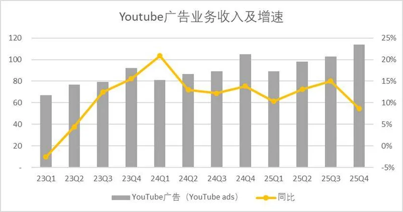 而YouTube的表现确实不如搜索广告亮眼,四季度录得营收114亿美元,增速从平均12-13%,下滑至8.7%。管理层在业绩会中承认,四季度Youtube增速放缓,主要是因为去年四季度是大选年,基数过高,当然2026年又到了中期选举年,可能会再次迎来一波增速回暖。