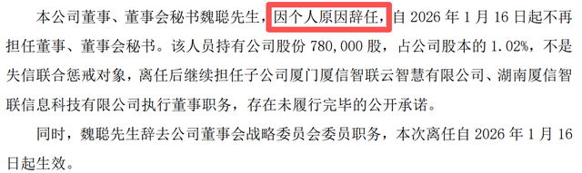 1月16日,路桥信息还同步披露了《董事、董事会秘书辞职公告》。公告显示,魏聪“因个人原因”辞任,自2026年1月16日起不再担任董事、董事会秘书。