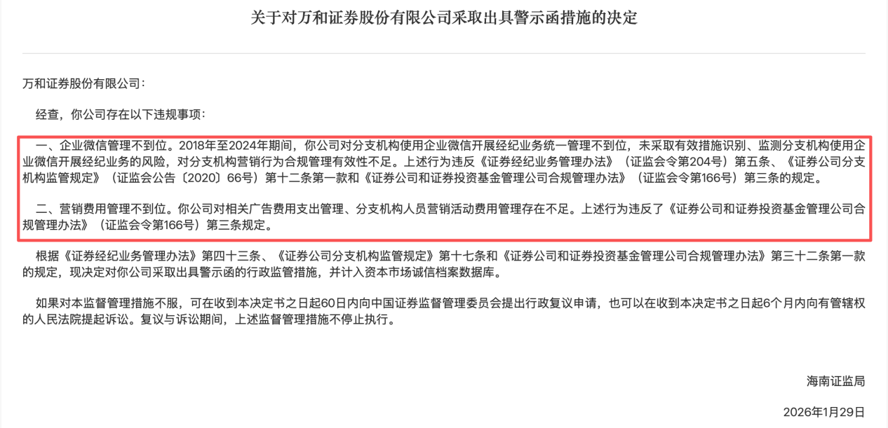 从罚单表述来看,万和证券企业微信管理不到位长达6年。