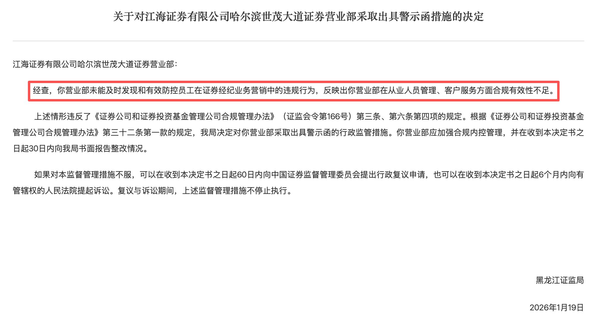江海证券的罚单出现“机构+个人”双罚,证券从业人员与分支机构均因违规遭罚。