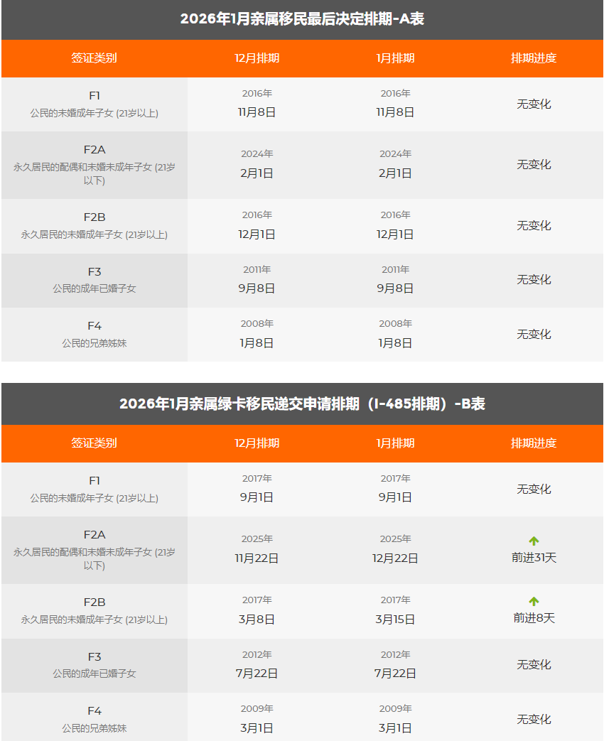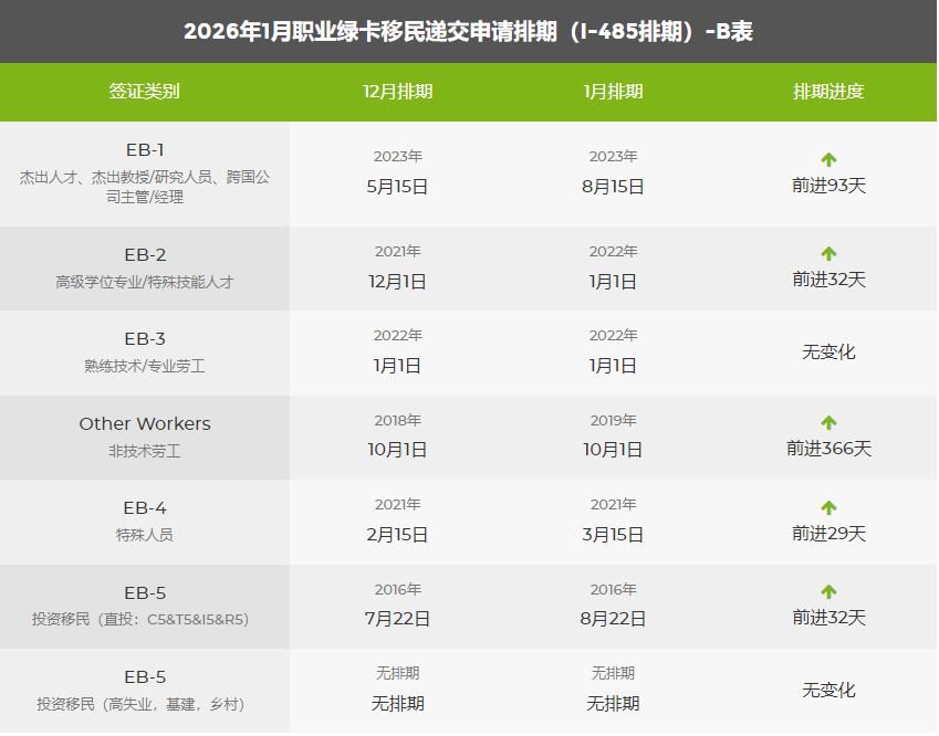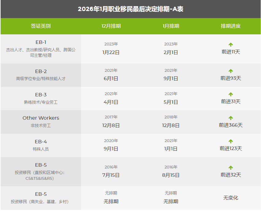 国务院公布的2026年1月绿卡移民排期公布,亲属移民停滞不前,职业移民各个类别均有前进。