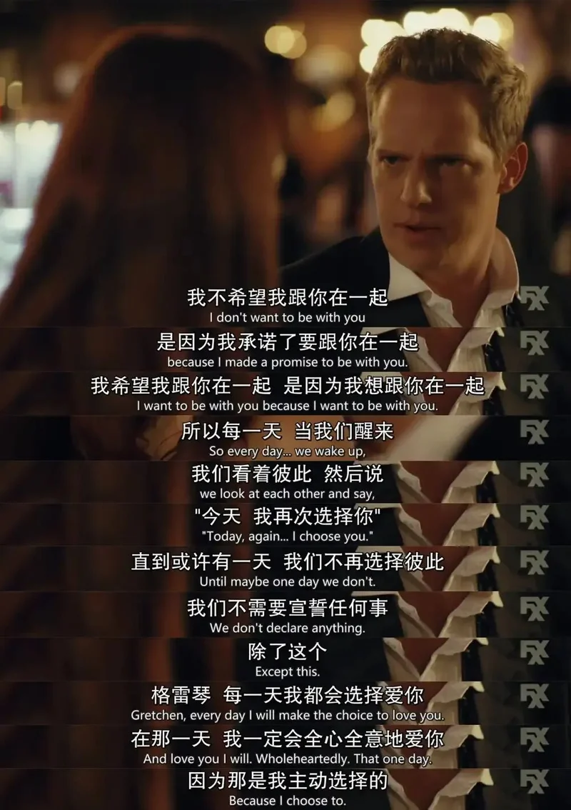 后者讲述的是以刻薄形象示人、却同样会为亲密关系而患得患失的两个年轻人的故事。在最终季的末尾,当面临是否要做出踏入婚姻的决定时,男主Jimmy对女主Gretchen提出解决方案:比起结婚,不如每天醒来都做一次选择,要不要和对方在一起。而Gretchen对此也很高兴:“你知道我喜欢总是有一只脚在门外,随时逃跑。”