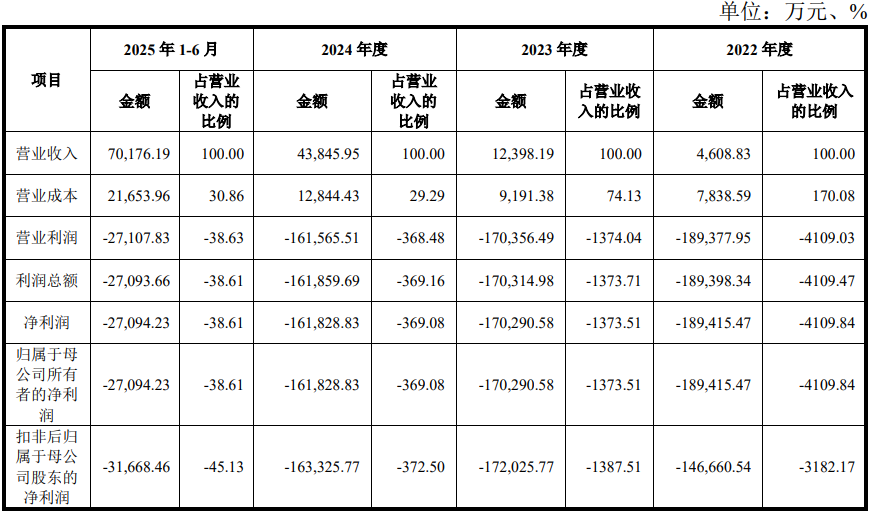 招股书显示,摩尔线程2022年至2024年营收分别为4608.83万元、1.24亿元、4.38亿元,今年上半年营收达到7.02亿元,一举超过了此前三年营收总和。同时,摩尔线程预计,2025全年营业收入为12.18亿元至14.98亿元,较2024年同期增长177.79%至241.65%。