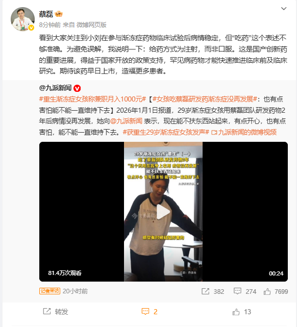 今日,蔡磊转发相关报道并回应称,看到大家关注到小刘在参与渐冻症药物临床试验后病情稳定,但“吃药”这个表述不够准确。