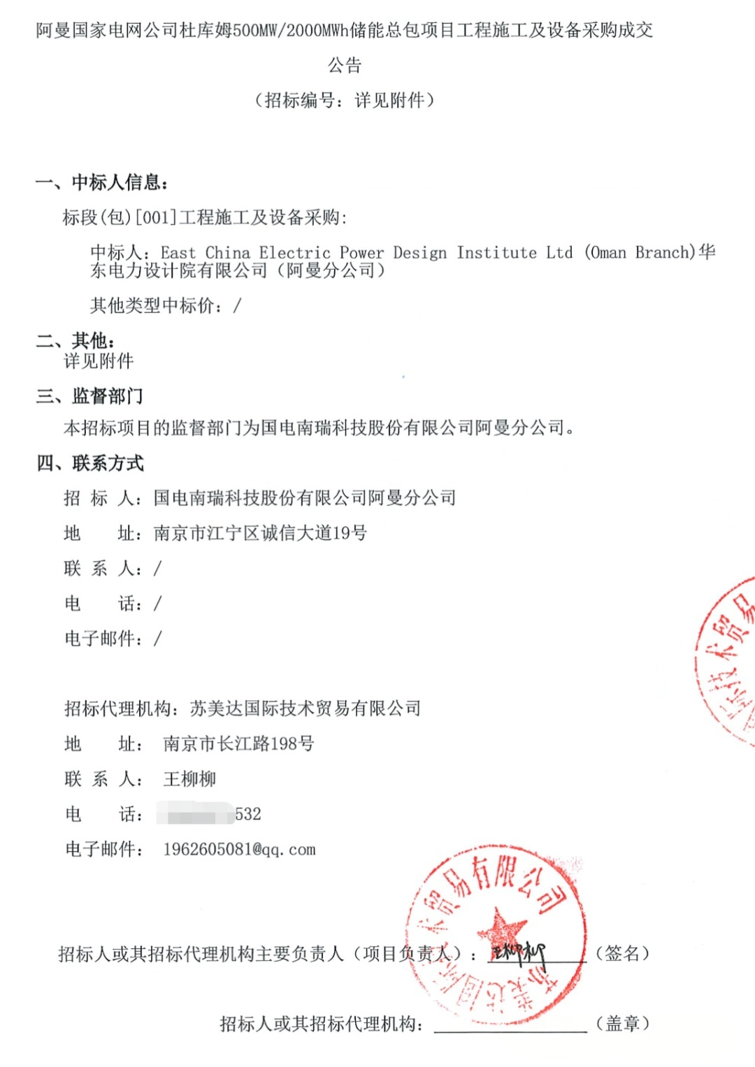 工程施工及设备采购中标人为华东电力设计院有限公司(阿曼分公司),是中国能建华东院在阿曼设立的本地化分支机构。