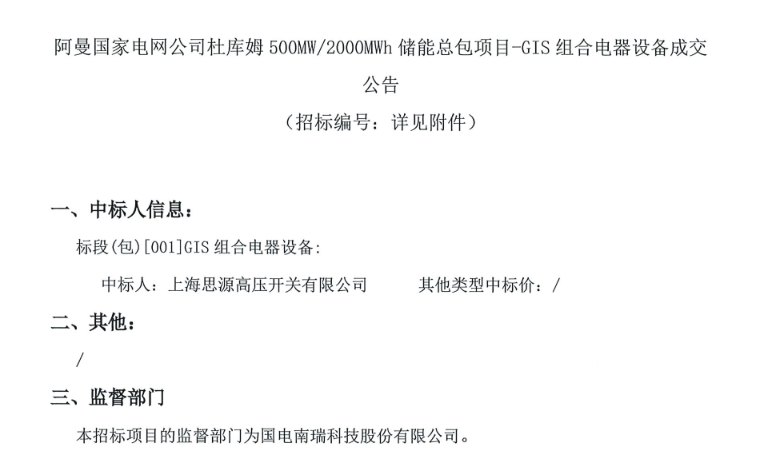 近日,阿曼国家电网公司杜库姆500MW/2000MWh储能总包项目发布电池舱成交公告,中标人为上海思格源智能科技有限公司。据悉,该公司是思格新能源(上海)股份有限公司全资子公司。