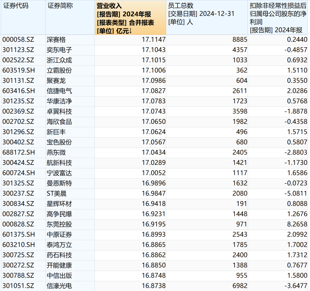 由于2025年年报还未披露完毕,下面是2024年营业收入也在17亿附近的上市公司情况: