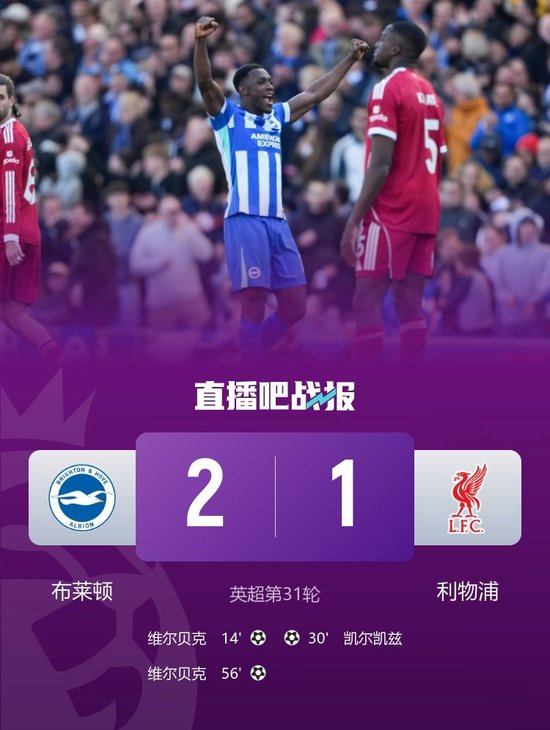 直播吧3月21日讯 北京时间3月21日晚上20:30,英超第31轮,布莱顿坐镇美国运通社区球场对阵利物浦。上半场,埃基蒂克伤停,维尔贝克破门,邓克乌龙助攻凯尔凯兹破门。下半场,维尔贝克梅开二度。全场结束,布莱顿2-1利物浦。本场过后,布莱顿积43分暂升第八;利物浦积49分排名第五,仅领先第六的切尔西1分。