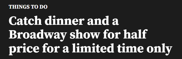 纽约百老汇周(NYC Broadway Week)及纽约必看周(NYC Must-See-Week): 将提供“买一送一”的超值优惠,涵盖各大百老汇剧目、博物馆、著名景点、游览线路以及各类表演艺术。