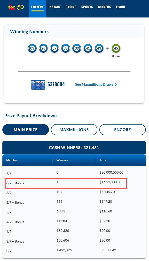 当晚Lotto Max开出的7个号码依次为03、28、37、38、39、41、43,结果头奖8000万没人中,而石先生的彩票是中了其中的6个号码,另外第7个号码是特别号码45。