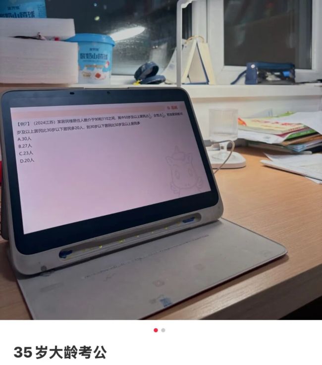 第一批下定决心,冲击考公的中年人,是那些刚被年龄红线卡掉了的考公玩家,如今年龄放宽,他们便卷土重来了。也因此,他们人均比去川藏净化心灵的人还要虔诚。左手保温杯泡枸杞,右手真题卷刷行测,在“鸡娃”的间隙争分夺秒背诵申论范文,争取在再次到达年龄红线前,一站上岸。