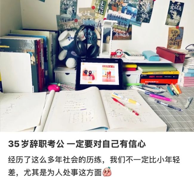 但随着考公年龄的放开,35岁后去考公成了这群中年人们最后的退路。有人说,35岁正是适合考公的年纪。“年轻时外出拼搏见见世面,或是在大厂里卷出了足够的钱,等到35岁直接辞职考公,这时钱也攒够了,也不必担惊受怕自己被优化了。”