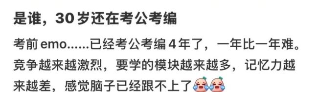 虽然大龄考公困境重重,不仅需要面对年纪大了背完就忘的“金鱼记忆”,更有可能因为常年积累下来的三高,导致体检根本过不了,但这阻挡不了一批又一批35+中年人冲进体制内的决心——
