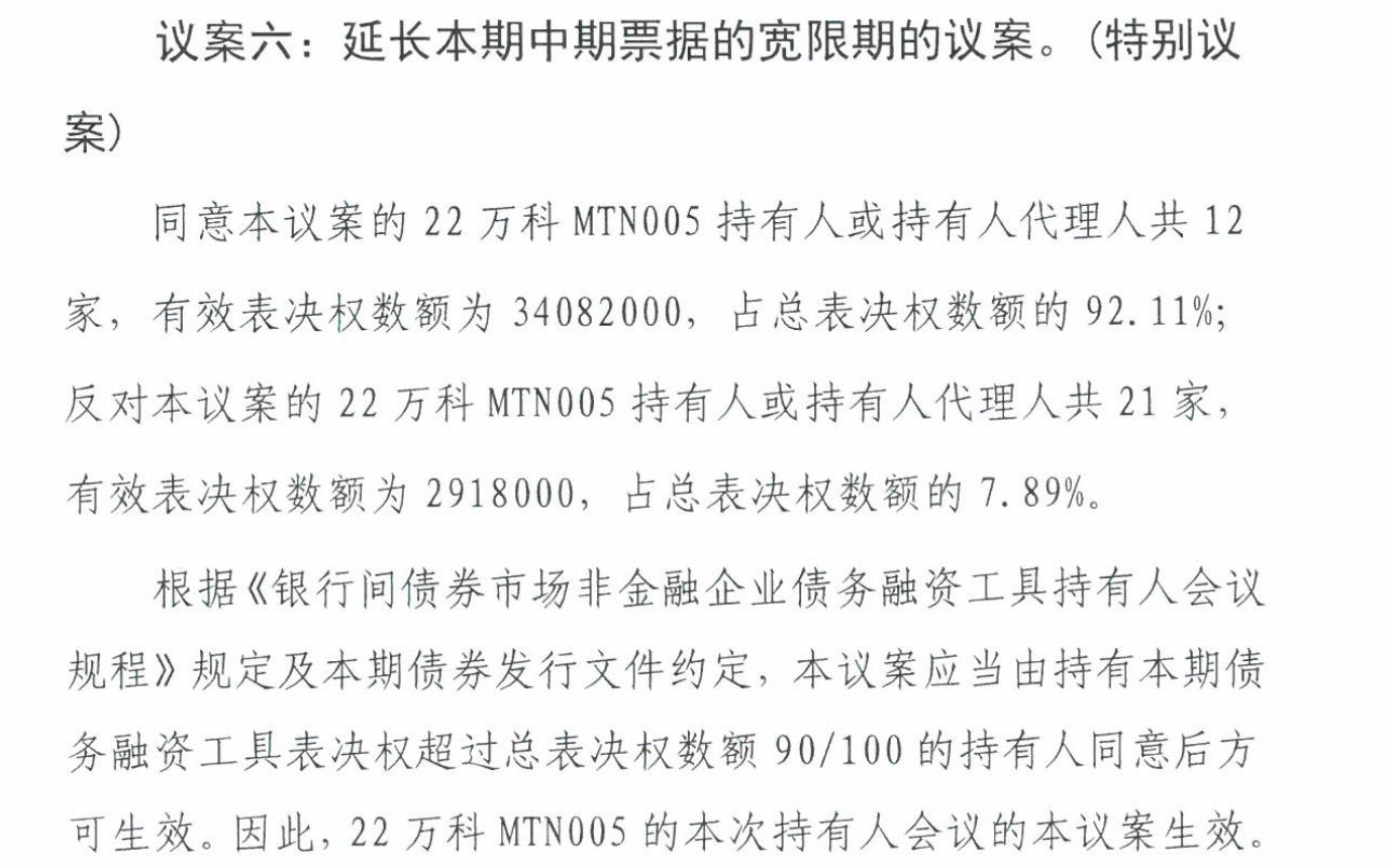 12月26日,“22万科MTN005”第一次持有人会议决议公告显示,本次5个与展期相关的议案均未获得超过90%表决权持有人同意,仅延长本期中期票据的宽限期议案获得92.11%的投票同意。