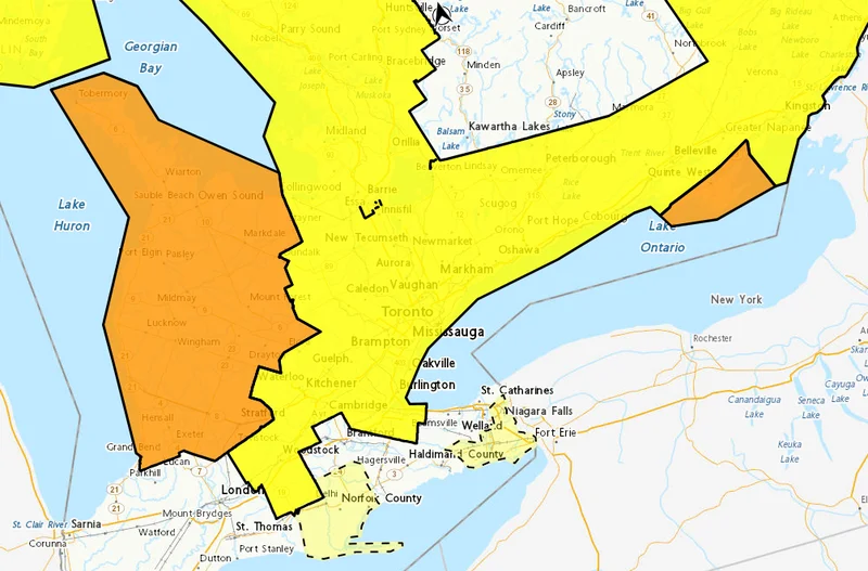 休伦湖和乔治亚湾附近的降雪带地区将受到更长时间的影响,阵风同样可达 70–90 公里/小时,降雪量预计 20–40 厘米。