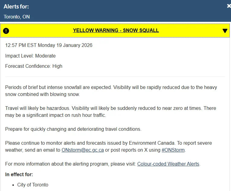 据天气网络今早(1月19日)报道,一场持续时间较长的冬季天气过程正在影响几乎整个安省南部地区,包括整个大多伦多。目前,环境部已经对多地发布暴风雪警告、阵雪(雪带)警报以及吹雪提示,尤其是降雪带区域,出行条件极其危险。