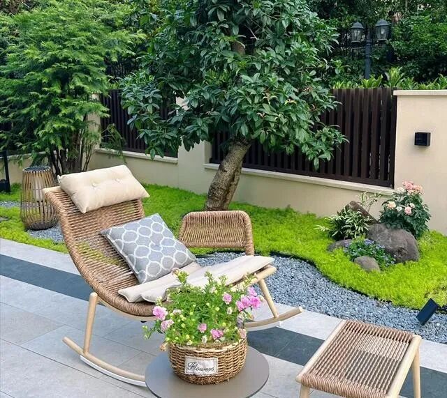一张藤编小桌 , 两把折叠椅 , 没什么复杂的装饰 , 就是个简简单单的喝茶角落 , 她经常在那里读书晒太阳 , 猫咪也会跳上桌子蜷成一团睡觉 , 那画面太治愈了 , 真的就是岁月静好的最好诠释。