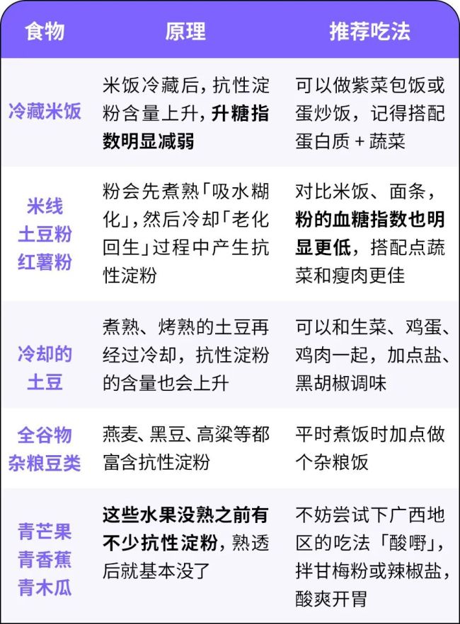 ✅ 措施:在日常饮食中,咱们可以在主食中增加抗性淀粉的比例,具体怎么做,给大家整理好表格啦——