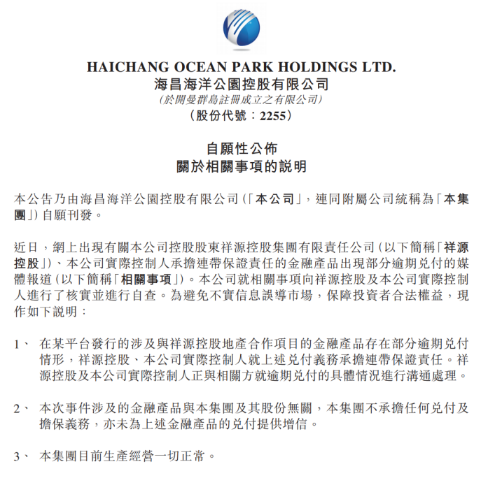 12月7日晚间,祥源文旅、交建股份、海昌海洋公园针对前述事项同步发布声明,确认了存在部分金融产品兑付逾期的情况,并表示上市公司不承担任何兑付及担保义务。