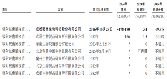 不过欧林生物在吸附破伤风疫苗的统治地位正在被追赶。招股书显示,目前市面上共有7款吸附破伤风疫苗在售,按批签发量计算,欧林生物和武汉生物几乎分食了全部市场。