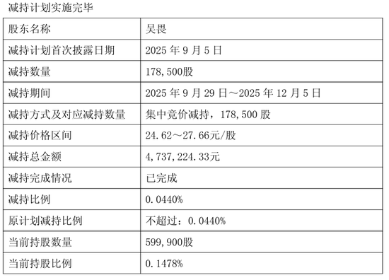 几乎同一时间,2025年9月29日-2025年12月5日,公司副总经理、董事会秘书吴畏通过集中竞价方式减持公司股份178,500股,占公司总股本的0.0440%,变现473.72万元,持股比例降至0.1478%。