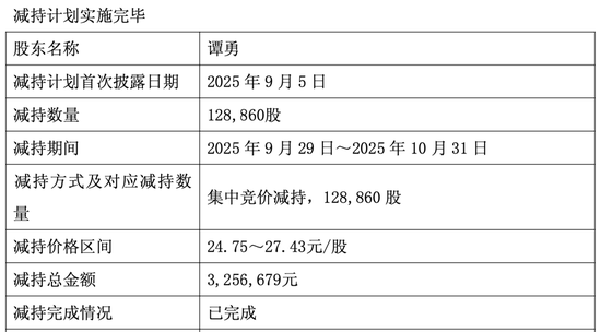 此外,2025年09月29日-2025年10月31日期间,公司副总经理、财务负责人谭勇通过集中竞价方式,以24.75元/股-27.43元/股的价格,累计减持128,860股,变现325.67万元,减持后持股比例从0.14%降至0.1090%。