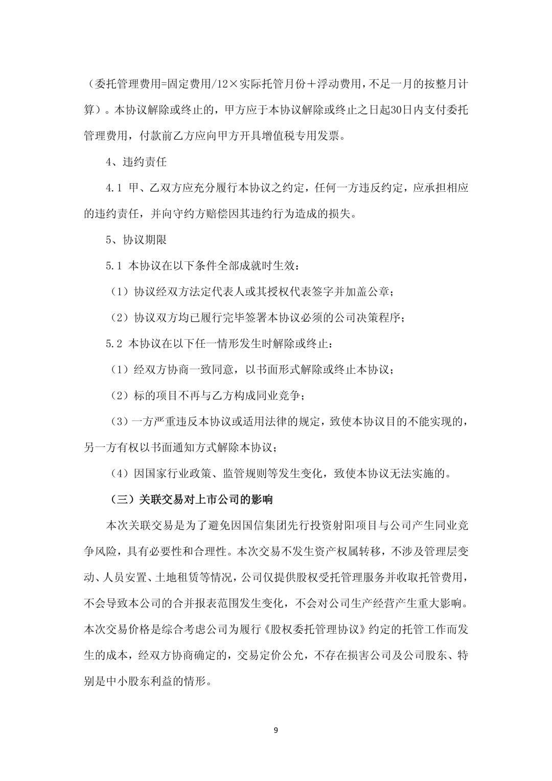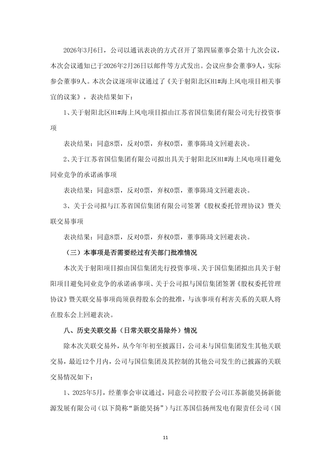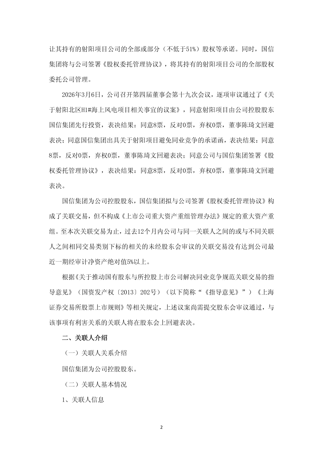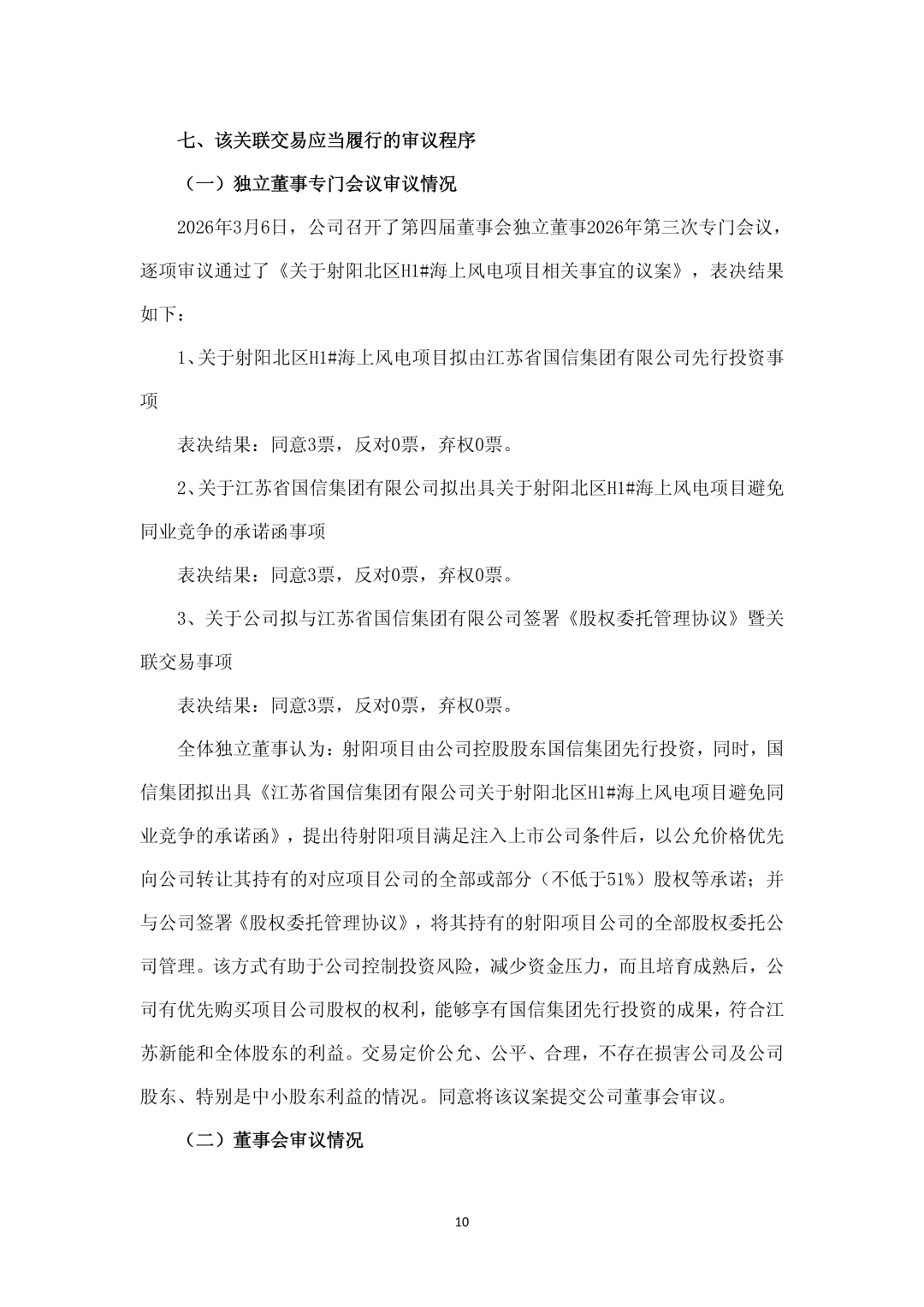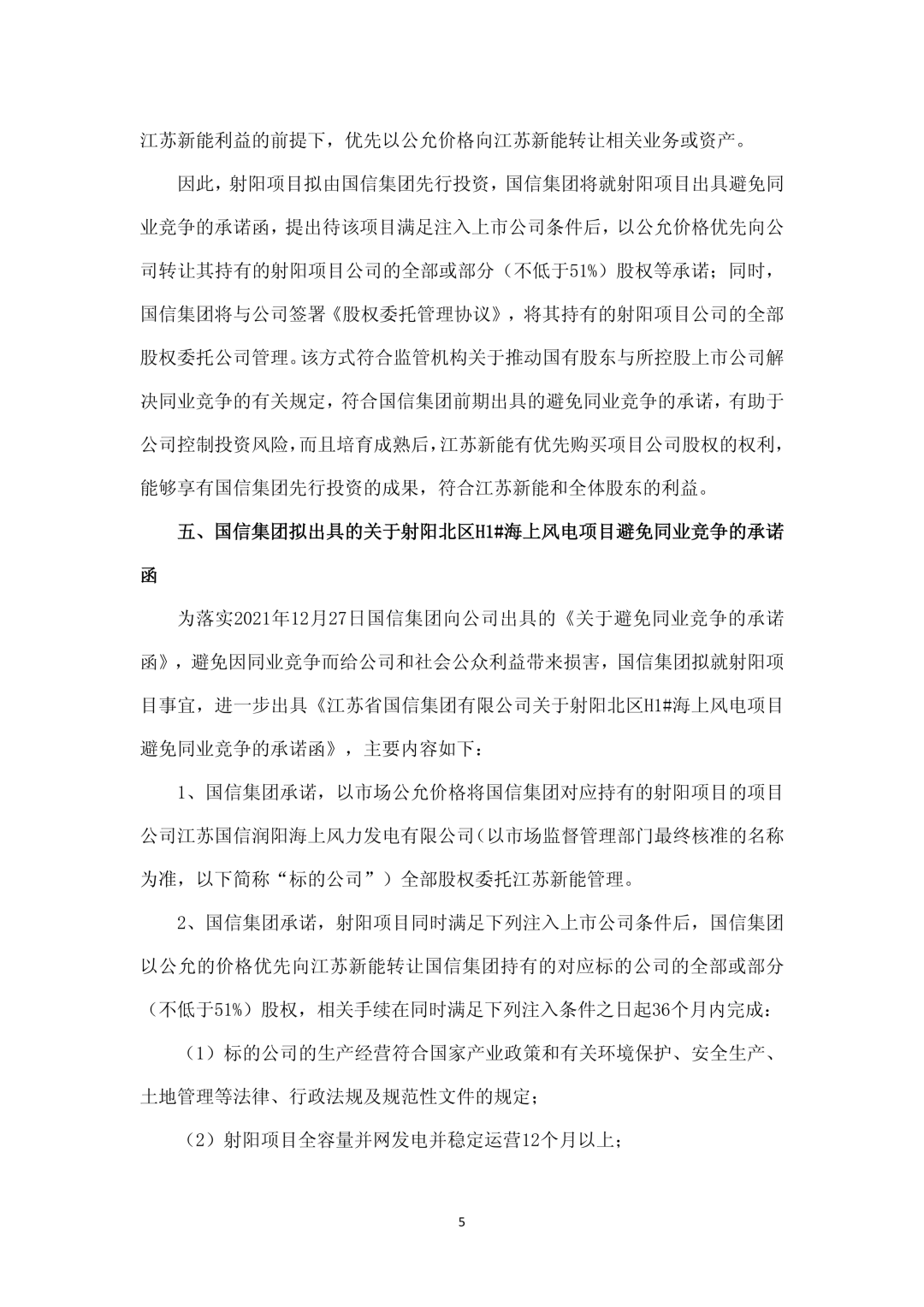 为了有效避免同业竞争,经公司与国信集团充分协商,射阳项目拟由国信集团先行投资,国信集团将就射阳项目出具避免同业竞争的承诺函,提出待该项目满足注入上市公司条件后,以公允价格优先向公司转让其持有的射阳项目公司的全部或部分(不低于51%)股权等承诺。同时,国信集团将与公司签署《股权委托管理协议》,将其持有的射阳项目公司的全部股权委托公司管理。