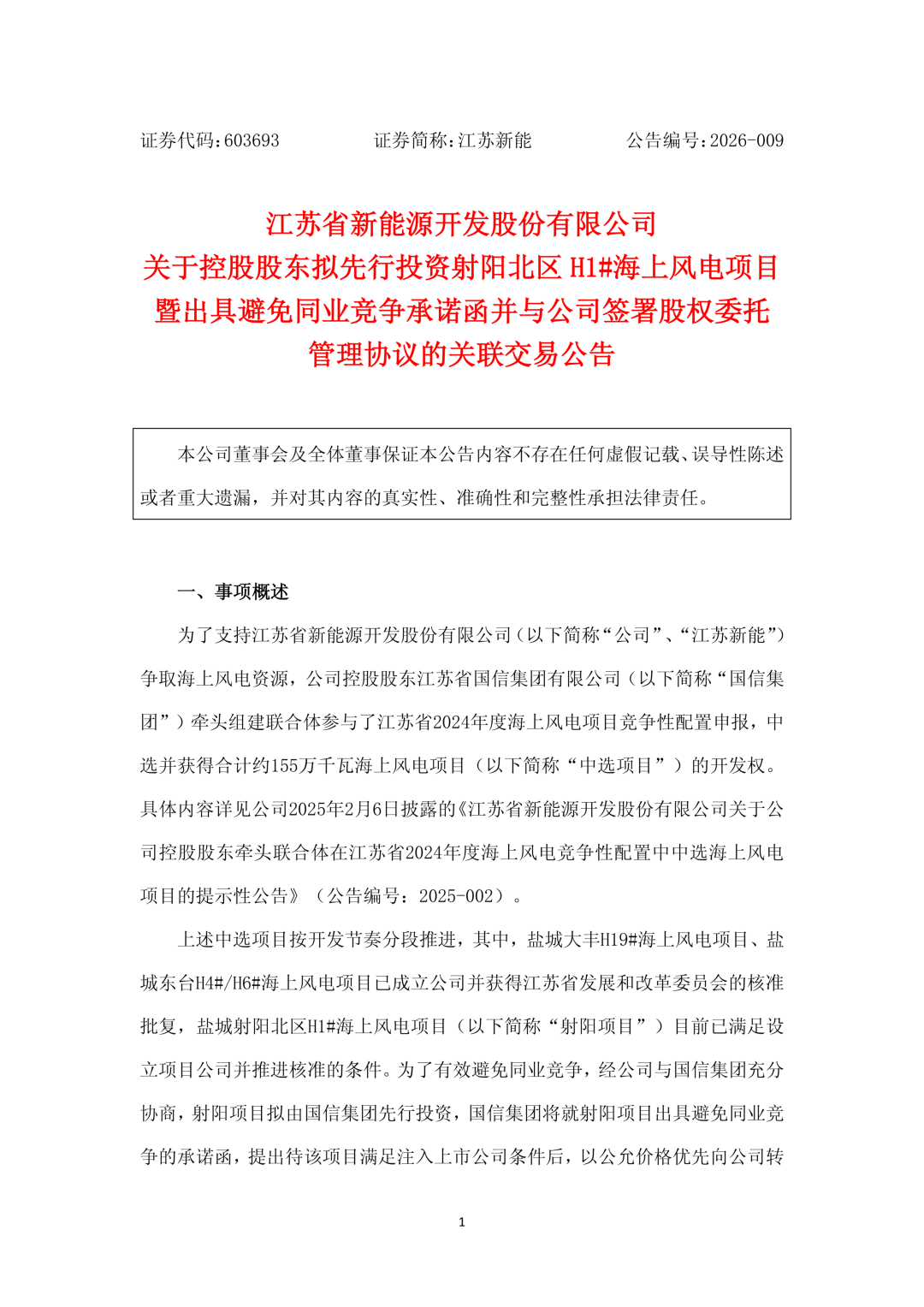 风芒能源获悉,3月7日,江苏省新能源开发股份有限公司(简称“江苏新能”)发布《关于控股股东拟先行投资射阳北区H1#海上风电项目暨出具避免同业竞争承诺函并与公司签署股权委托管理协议的关联交易公告》。