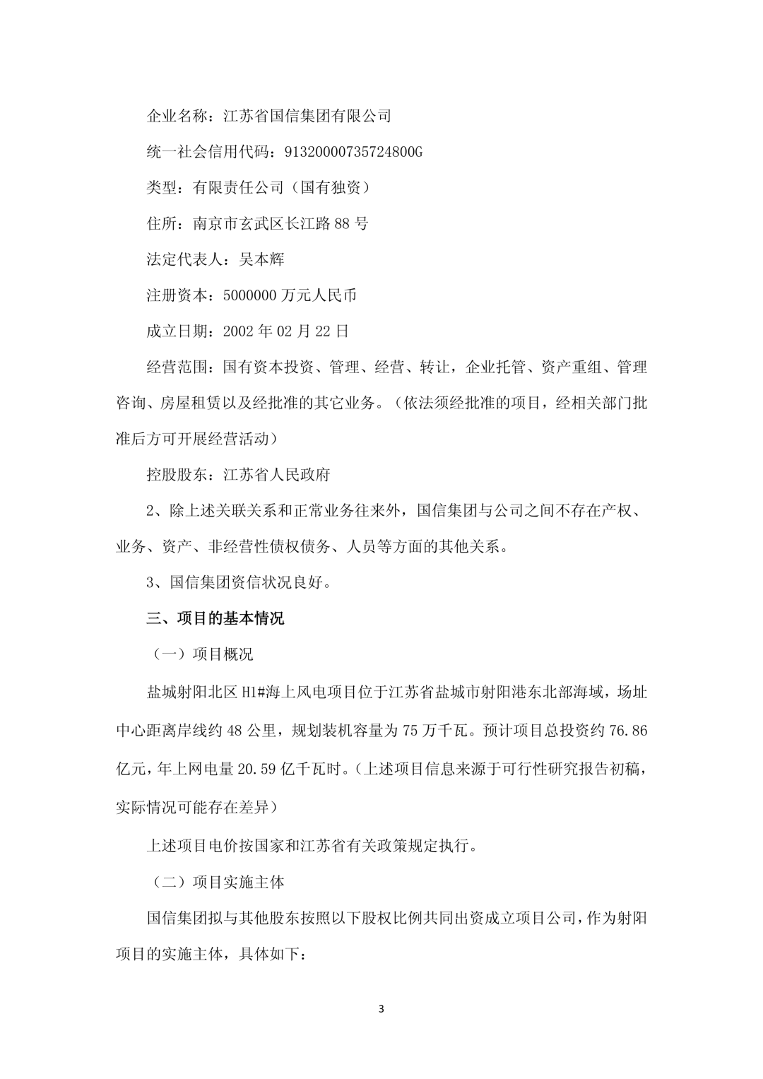 上述中选项目按开发节奏分段推进,其中,盐城大丰H19#海上风电项目、盐城东台H4#/H6#海上风电项目已成立公司并获得江苏省发展和改革委员会的核准批复,盐城射阳北区H1#海上风电项目(以下简称“射阳项目”)目前已满足设立项目公司并推进核准的条件。
