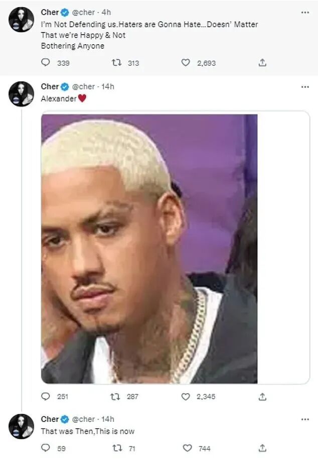知情人爆料,雪儿对这段感情百分百全情投入。她不止一次公开秀恩爱,夸亚历山大帅气、才华横溢。她对男友和前女友所生的儿子Slash也是视如己出,大赞孩子聪明、风趣、招人疼。