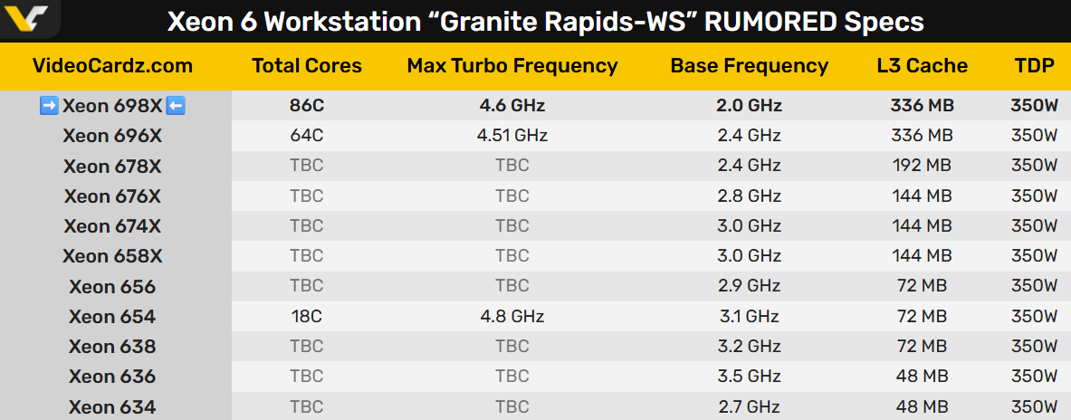 GeekBench里出现了旗舰型号至强698X,明确有86核心172线程、336MB三级缓存,主频最高4.6GHz(基准2.0GHz),热设计功耗350W。