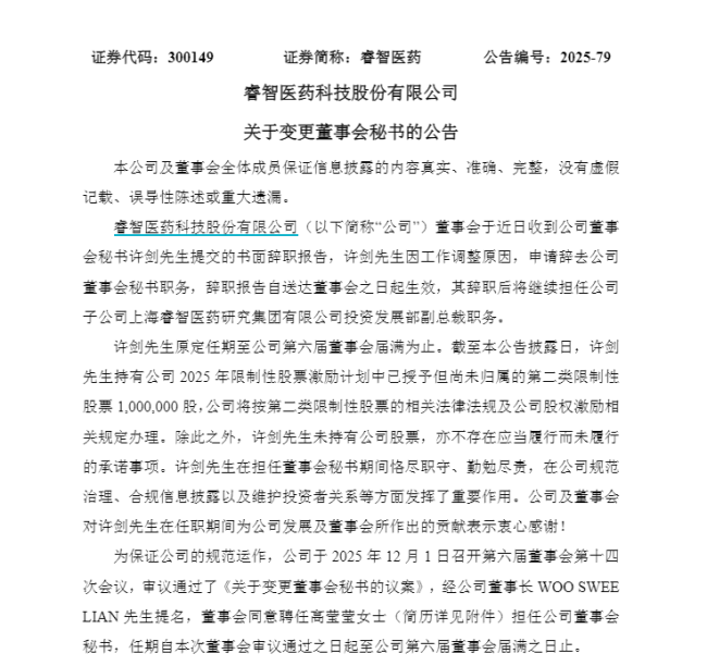 据红星资本局 12 月 10 日消息,近日,睿智医药发布公告称,公司董事会于近日收到董事会秘书许剑提交的书面辞职报告,许剑因工作调整原因申请辞任,其原定任期至公司第六届董事会届满为止。其原定任期至 2027 年 11 月 14 日,属于任期未满提前卸任。