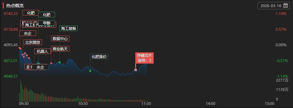 盘面上,上周现货黄金连续第二周收出阴线,引发贵金属、稀有金属等板块下挫,山金国际(000975)、西部黄金(601069)、云南铜业(000878)跌幅居前。化工股冲高回落,环氧丙烷方向领跌,万华化学(600309)、中国化学(601117)等股跌超5%。此外,前期表现强势的电网设备、电力板块同样调整,望变电气(603191)、正泰电器(601877)领跌。另一方面,中东局势持续紧张,资金继续炒作粮食概念股,农发种业(600313)收获涨停,康农种业、敦煌种业(600354)跟涨。白酒、食品加工板块逆势上扬,西王食品(000639)涨停,贵州茅台(600519)、五粮液(000858)等股同样有所上涨。