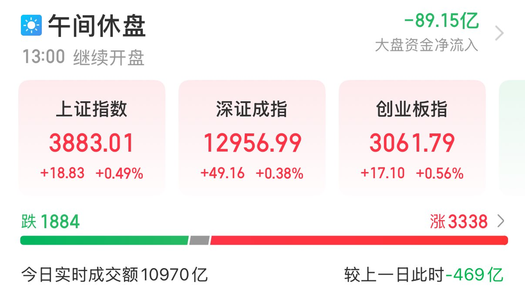 A股三大指数集体上涨,截至午盘,沪指涨0.49%,深成指涨0.38%,创业板指涨0.56%,北证50指数跌0.09%,沪深京三市半日成交额10970亿元,较上日缩量469亿元。全市场超3300只个股上涨。