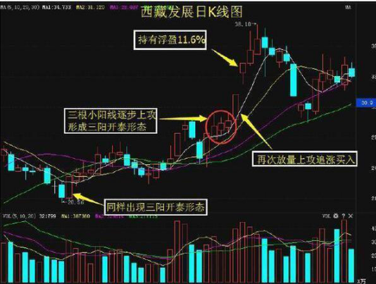 技术含义:当一只股票出现连续三根小阳线进行调整,第四天出现巨量拉升,而显现大阳线,往往预示后面还会至少还会有惯性的上攻,短期有比较大的获利机会。