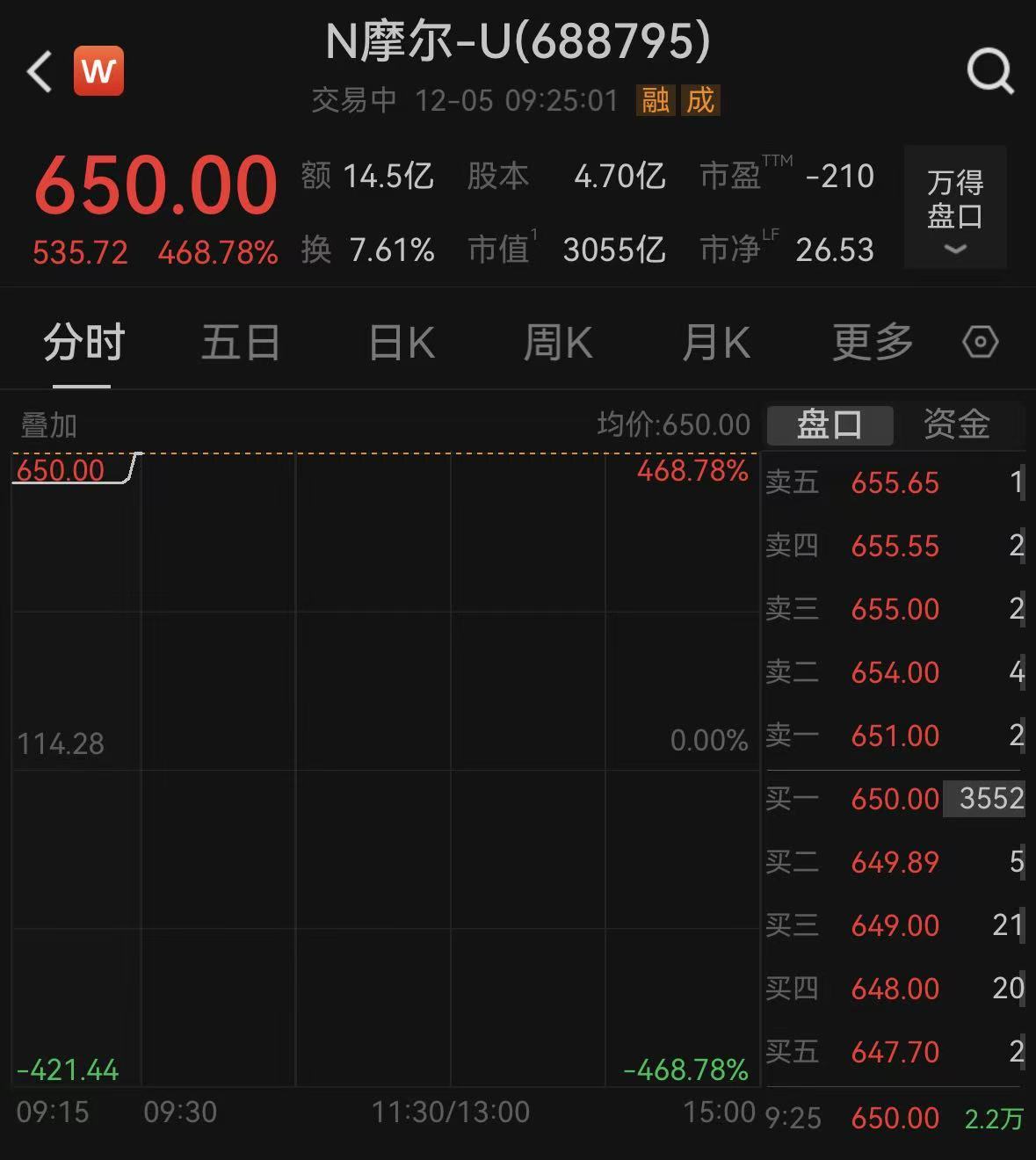 “国产GPU第一股”摩尔线程上市首日高开468.78%,总市值3055亿元,报650元/股。