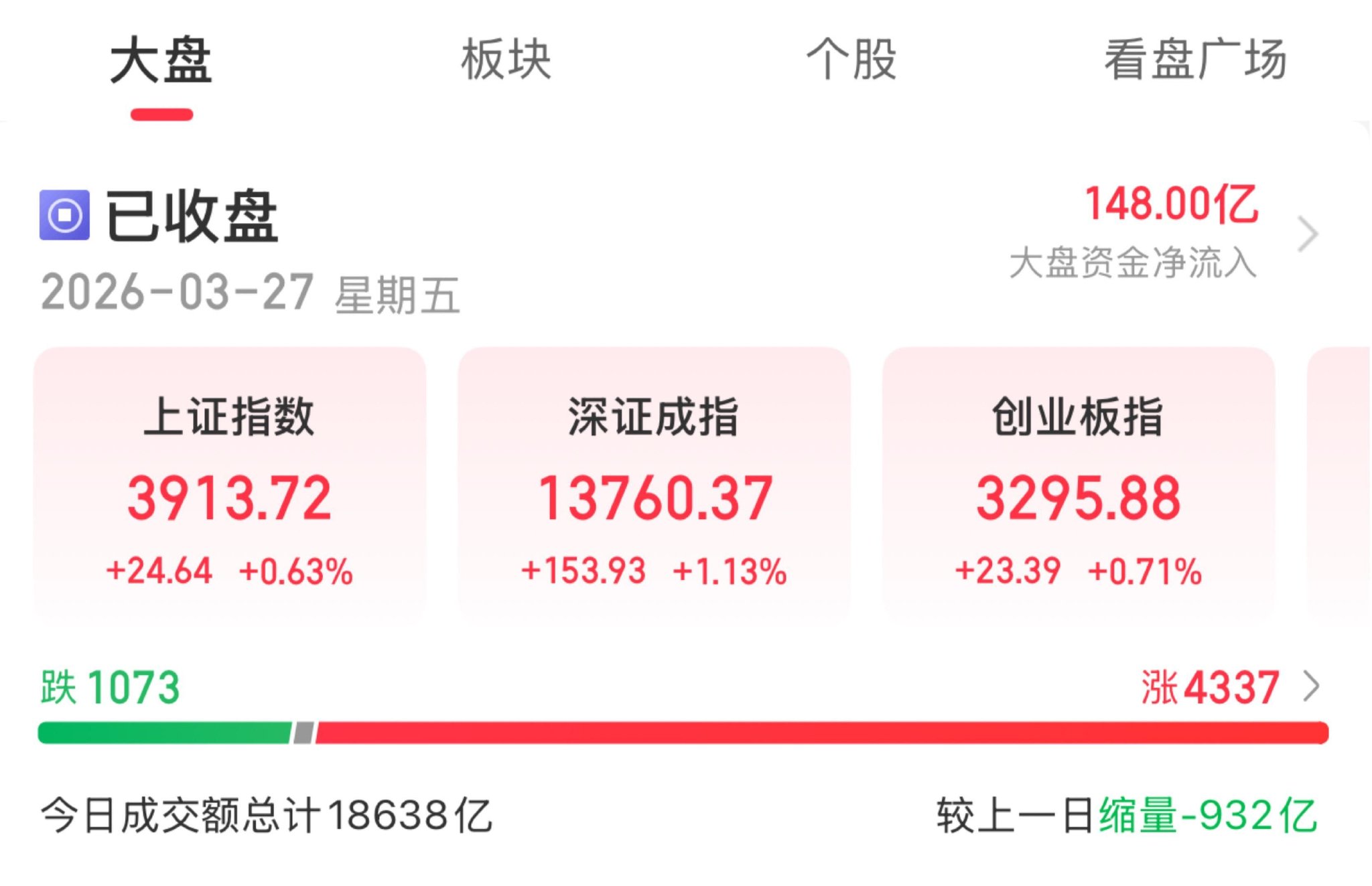 A股三大指数今日集体上涨,截至收盘,上证指数涨0.63%,深成指涨1.13%,创业板指涨0.71%,北证50指数涨0.37%,沪深京三市成交额18638亿元,较上日缩量932亿元,三市超4300只个股上涨。