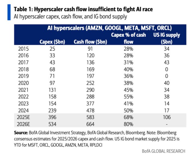 策略师Michael Hartnett在报告中写道,对亚马逊(AMZN.US)、谷歌(GOOGL.US)、Meta(META.US)、微软(MSFT.US)和甲骨文(ORCL.US)等超大规模科技公司而言,其现金流已不足以支撑当前这场“AI资本支出军备竞赛”。