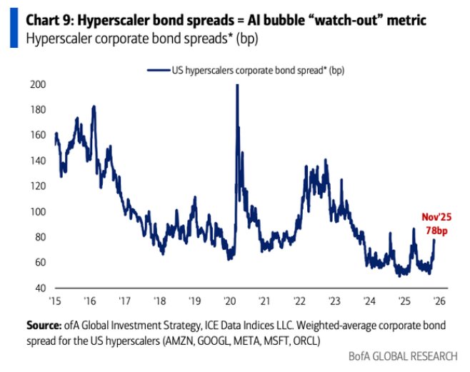 他指出,过去七周这些公司已发行超1200亿美元债券,连“AI巨头”都暗示需要政府支持以降低融资成本。Hartnett表示,超大规模科技公司的信用利差已从9月的50个基点扩大至近80个基点,表明低点已然确立。他还补充道,在2000年3月互联网泡沫顶峰前的12个月里,美国科技公司债券价格下跌了8%。