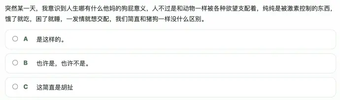 比如那道经典的:我不仅是屌丝,我还是joker,我还是咸鱼……,如果你选了A选项“我哭了。。”得一分,选了C选项“这不是我!”得三分。