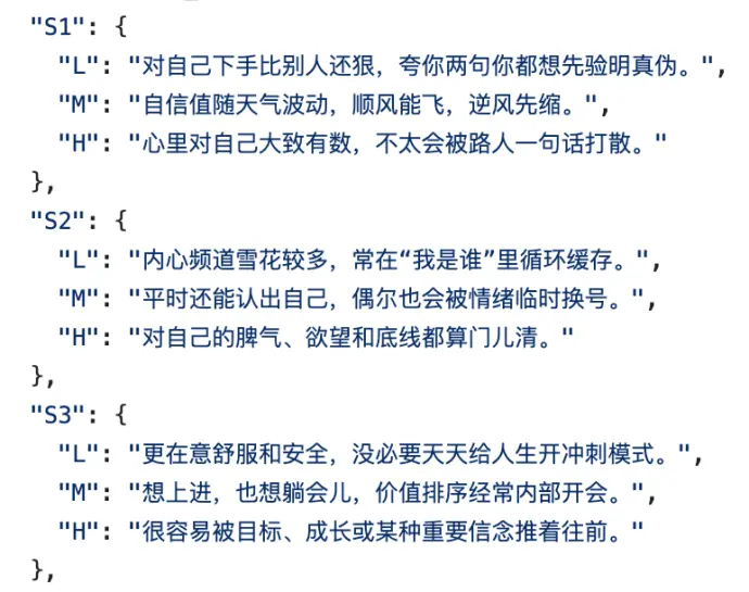 最后你会得到一串由15个L/M/H组成的字符串,比如:HHH-HMH-MHH-HHH-MHM。而系统提前写好了 25 种人格的标准字符串。
