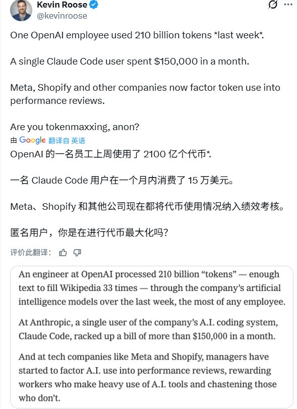 一位OpenAI的工程师在一周内通过公司的AI模型烧掉了2100亿个Token(相当于33个维基百科全部文本的总和),位居全公司第一。在另一家AI公司Anthropic,一名Claude Code用户在一个月内就产生了超过15万美元的账单。